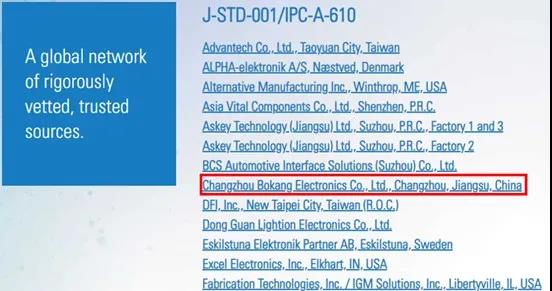 博康電子的生產(chǎn)工藝與產(chǎn)品質(zhì)量,完全符合電子行業(yè)國際標(biāo)準(zhǔn)IPC J-STD-001《焊接的電氣與電子組件要求》與IPC-A-610《電子組件的可接受性》三級產(chǎn)品要求,意味著該公司生產(chǎn)的電子組件具有很高的可靠性和一致性。因此,作為電子行業(yè)的最佳實(shí)踐典范,該公司被列入IPC QML/QPL全球可信資源庫,在線查詢:www.ipcvalidation.org。
